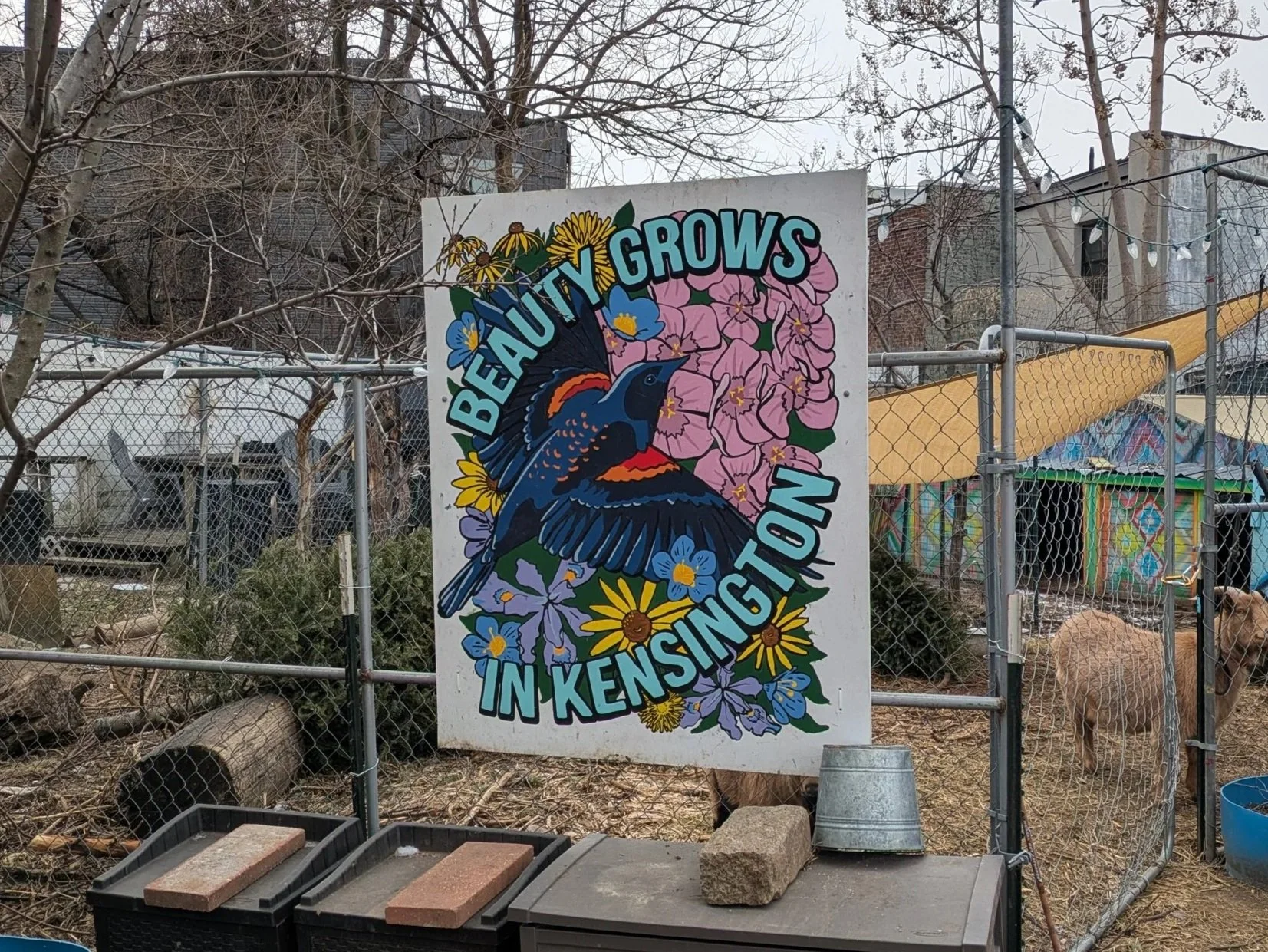 Our final project together resulted in a collaborative painted mural panel installed within the farm. Local artist Meg Lemieur and I developed a concept, and design, then constructed the panel in a paint-by-numbers format. The phrase “Beauty grows in Kensington” is a proud statement that points to the reality of flourishing resilience in a place where many only see poverty, violence, and addiction. We hosted a painting booth at the farm’s annual party “Art on Hart” where neighbors were encouraged to add their contributions to the panel. Community members were thrilled to add brush strokes to the piece and expressed excitement at seeing a new art work displayed in the farm that they had a part in. The finished panel is now hung within the farm displayed toward the street for neighbors and passersby to enjoy.